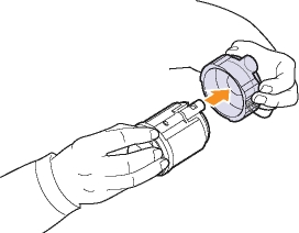 • Положите контейнер на ровную поверхность так, чтобы тонер не высыпался.