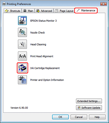 Если вам нужно заменить картридж до того, как останется мало чернил или он совсем опустеет, нажмите соответствующую кнопку на вкладке Maintenance (Сервис).
