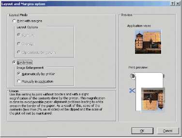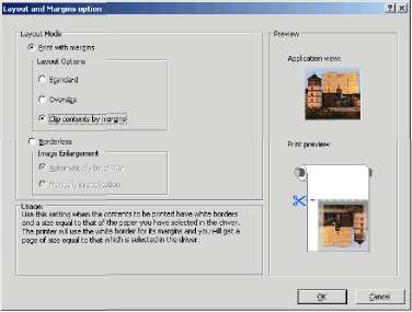 7. Если требуется выполнить печать на рулоне, необходимо решить, где должна обрезаться бумага. Нажмите кнопку Поля/Макет, а затем выберите Обрезать содержимое по полям.