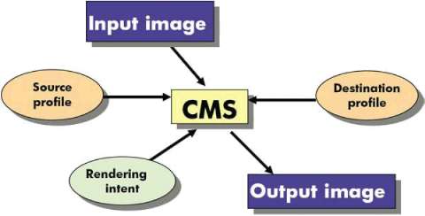 2. Максимально эффективное преобразование цветов красок с использованием системы управления цветом (Color Management System — CMS). CMS — это программа, которая с помощью информации из ICC-профилей преобразует цветовое пространство одного устройства (определенное исходным профилем) в цветовое пространство другого устройства (определенное целевым профилем). Но что делать с теми цветами, которые существуют в гамме одного устройства, но не представлены в гамме другого? Более подробно этот вопрос будет освещен позже.