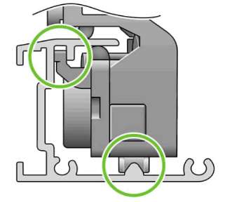 Два колесика в нижней части резака должны встать на центральный выступ рельсы, а два направляющих вкладыша — войти в паз в верхней части рельсы.