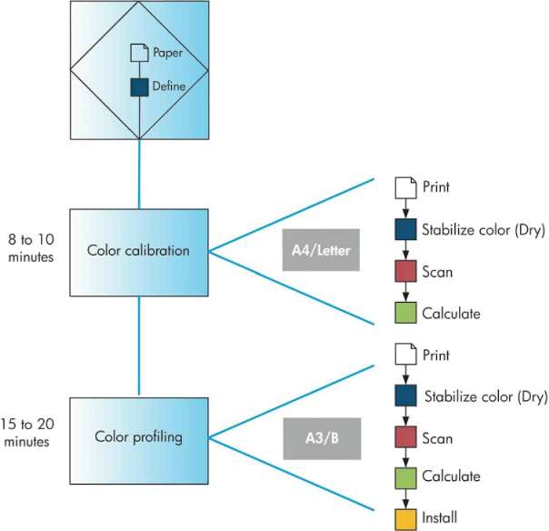 Можно выполнить все три действия в указанной последовательности либо начать с любого шага или остановиться после любой из трех операций. Есть одно исключение: калибровка цвета выполняется автоматически после добавления нового типа бумаги.